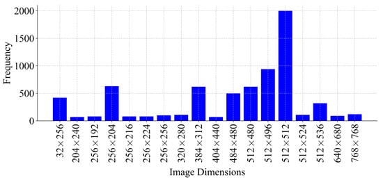 An analysis of the dimensions of these images was conducted, revealing variability not only across different patients but also within the same patients (Figure 4). A resolution of 512 × 512 pixels was the most frequently observed, justifying its selection as the image standard dimension for preprocessing. Therefore, all images were resized to 512 × 512 pixels due to the predominant frequency in the data set. Images smaller than this resolution were padded, while larger images maintained uniformity.