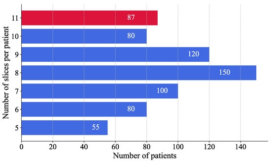 A histogram analysis was performed to assess the distribution of MRI images per patient (Figure 5). The results showed that most patients had eight images. To ensure consistency across patient data and to avoid excluding individuals with fewer available MRI slices, the number of images per patient was standardised to eight, thereby maximising patient inclusion and minimising information loss. This selection, based on the modal value, facilitated the reconstruction of a volumetric representation of the brain from the most informative slices, approximated to a three-dimensional structure.