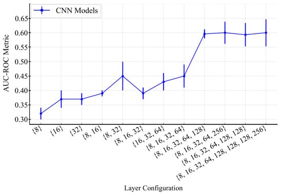 Performance of CNN models with different layer configurations. The graph illustrates the AUC-ROC metric across various CNN layer configurations, with error bars representing standard deviations.