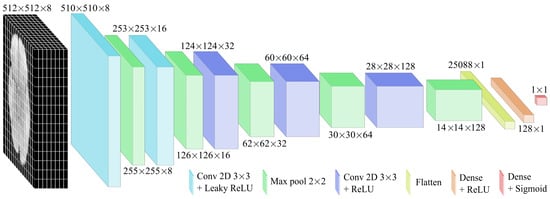 Based on these observations, the five-layer configuration was selected for final optimisation and evaluation. As shown in Figure 7, this structure enabled the modelling of complex hierarchical patterns while maintaining stable training. Accordingly, two activation functions were applied based on their advantages. The Leaky ReLU function was used in the initial layers to mitigate the dead-neuron problem and improve the gradient flow for negative inputs, while ReLU was employed in deeper layers due to its computational efficiency and effectiveness in image processing. The specifications of the CNN model are detailed in Table 3.