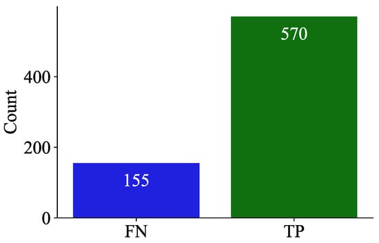 Bar chart illustrating the counts of false negatives (FNs) and true positives (TPs) in the predictions of the model on the EGD data set.