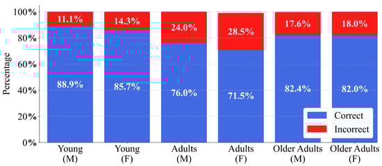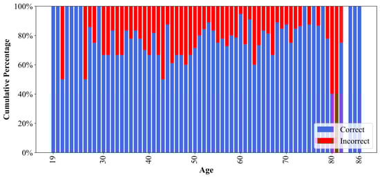 Percentage of correct and incorrect model predictions for each age in the EGD data set. The age 83 is omitted due to the absence of samples in the data set.