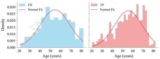The statistical analysis was conducted in three steps. Firstly, the Shapiro–Wilk test (Equation (1)) was performed to assess whether the age distributions in the FN and TP groups were normal. Secondly, the Mann–Whitney U test (Equation (2)) evaluated differences in age distributions across prediction outcome groups within age cohorts. Finally, the Chi-squared test (Equation (3)) was applied to evaluate the relationship between sex and the correctness of the predictions of the model. All analyses were performed using a two-tailed significance level of 0.05, a conventional threshold in hypothesis testing to control the probability of Type I error, since one in twenty (0.05) chances represents an unusual sampling event [35]. Statistically, this implies a 5% probability of falsely rejecting the null hypothesis; consequently, p-values above this threshold indicate insufficient evidence to reject it.