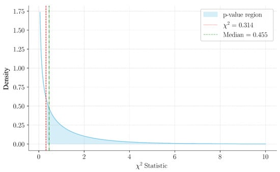 As detailed in Table 11, the computed Chi-square statistic was 0.314, with a corresponding p-value of 0.575. The p-value was calculated as . Since the statistic lies below the median of the distribution (), this aligns with a non-significant result, as visualized in Figure 13. The power analysis indicated a moderate capacity to detect a small effect size, thereby reinforcing the reliability of the results. These findings suggested that the statistical analysis did not provide strong evidence to confirm differences in accuracy based on sex, thereby supporting the generalisability of the model.