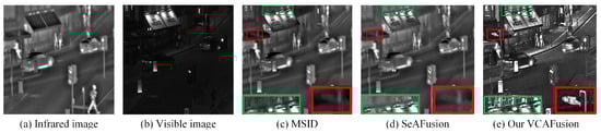 As shown in Figure 1, VCAFusion outperforms some state-of-the-art methods, like MSID [] and SeAFusion [], delivering richer visual features. It highlights high-temperature targets, enhances subtle textures, and seamlessly integrates essential information. The red and green regions in the comparison further illustrate these improvements.