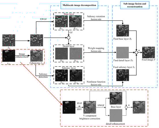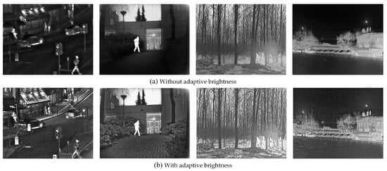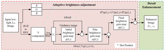 Based on the retinex theory [], we propose an adaptive brightness adjustment model to correct illumination degradation in night scenes and to enhance weak textures. The process is shown in Figure 3.