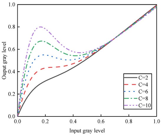 The adaptive low-light enhancement function is shown in Figure 4. The function dynamically adjusts brightness gains based on localized illumination components, with C directly influencing the upper bound of enhancement intensity. As demonstrated in the figure, when C is incrementally set to 2, 4, 6, 8, and 10, the brightness gain curve shifts upward, indicating heightened amplification for darker regions (lower input gray levels) while preserving brighter areas (higher input gray levels). This selective enhancement ensures a balanced luminance distribution, mitigating over-saturation in well-lit regions. The parameter α governs the transition sharpness between enhanced and non-enhanced zones, while β determines the threshold at which maximal gain is applied. Such adaptability allows the function to address non-uniform illumination effectively, optimizing perceptual quality across diverse lighting conditions. The resultant brightness gain map, g(Ls), thus reflects spatially variant corrections tailored to the image’s intrinsic illumination profile.