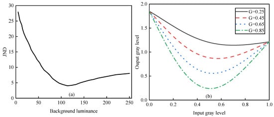 In low-light images, weak edges are easily overlooked. According to Weber’s law, a bright spot with luminance I + ΔI is perceptible only if ΔI exceeds a threshold, known as the just-noticeable difference (JND). As shown in Figure 5a, low illumination results in poor luminance discrimination, which improves as brightness increases. To balance over-enhancement in strong edges and under-enhancement in flat areas, we design a local detail adjustment function based on the Weber ratio curve. As shown in Figure 5b, setting G to 0.25, 0.45, 0.65, and 0.85 increases local brightness accordingly, enhancing details while preventing excessive sharpening. The function is defined as follows: