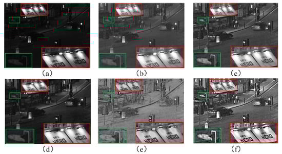 We evaluated the proposed low-light enhancement algorithm and compared it with others, as shown in Figure 6. Figure 6a is the Queen’s Road image, while Figure 6b–f present results from gamma correction [], GFCE [], SRIE [], MSretinex [], and our adaptive dimming method. From Figure 6b,d, it is apparent that, while the gamma correction and SRIE methods successfully improve background brightness, their enhancements are constrained, with certain local details remaining poorly resolved. Figure 6c shows the results of the GFCE method, which exhibits marginally better visual quality. The MSretinex method (Figure 6e) enhances the contrast but introduces significant color distortion. By comparison, both Figure 6c,f achieve substantial improvements. However, in Figure 6c, streetlights and billboards within the red-framed region appear blurred, lacking the contrast attained by the proposed adaptive low-light adjustment method in Figure 6f.