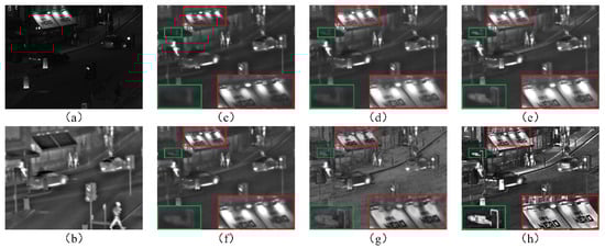We examined the impact of low-light enhancement on fusion results, as shown in Figure 7. Without enhancement (Figure 7c), the fusion suffers from poor brightness and contrast, whereas our method (Figure 7h) preserves rich details and superior visual quality. Zoomed-in comparisons of the two rectangular regions highlight the improved clarity and brightness in streetlights and billboards. Overall, the adaptive dimming algorithm effectively integrates complementary information and enhances weak textures in dark scenes.