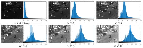 The brightness gain coefficient C in Equation (2) controls the degree of enhancement applied to the source image. A small C value results in insufficient contrast enhancement, failing to reveal object details, while an excessively large C over-amplifies edges, causing contrast imbalance. Figure 8 shows a detailed analysis of histogram evolution under varying enhancement parameters (C = 2 to 10). The results reveal that, while increasing C values effectively expand the histogram and improve image contrast, they introduce characteristic artifacts in the mid-tone range (0.4–0.6 intensity). Specifically, at C = 6, the histogram begins to exhibit subtle discontinuities—manifested as minor gaps and abrupt transitions—due to the algorithm’s localized contrast stretching of originally smooth luminance gradients. These artifacts become significantly more pronounced at C = 8, where the histogram shows visible fragmentation and artificial segmentation of continuous tonal distributions. This phenomenon occurs because the enhancement algorithm’s aggressive contrast expansion disproportionately amplifies mid-tone variations, particularly in regions with naturally gradual transitions, like skies or shadows. Importantly, while the artifacts at C = 6 remain below perceptual thresholds and only detectable through statistical analysis, those at C = 8 may become visually apparent in certain scenarios. Our comprehensive evaluation confirms that C = 6 represents the optimal trade-off, providing substantial contrast improvement while maintaining acceptable histogram integrity, whereas higher values prioritize dynamic range expansion at the cost of introducing noticeable artifacts in the mid-tone regions.