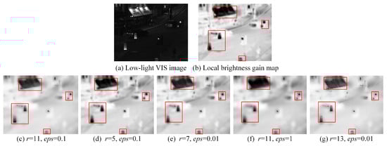 In Equation (4), mean filtering generates the initial brightness gain map but introduces halo artifacts and edge blurring. To mitigate these issues, we employ the SWGF method for refined mapping, which effectively suppresses halos. As illustrated in Figure 9, the optimal results are achieved with parameters r = 13 and ε = 0.01, preserving edge sharpness. Furthermore, Figure 10 analyzes the influence of parameter λ in Equation (17) on fusion performance. At λ = 2, infrared details appear faint. Increasing λ enhances the prominence of infrared features, particularly in bright regions; however, excessively high values (e.g., λ > 20) lead to overexposure. The best fusion performance is attained at λ = 20.