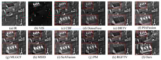 Figure 13 shows the fusion performance analysis for the “01432” image pair under challenging visibility conditions. The thermal image (Figure 13a) clearly displays pedestrian thermal signatures, while the corresponding visible (VIS) image (Figure 13b) suffers from significant smoke occlusion that obscures the pedestrian details. Our comparative evaluation reveals that most fusion methods, with the exception of MLGCF, SeAFusion, and our proposed approach, fail to adequately preserve thermal target information. While MLGCF successfully enhances the thermal target brightness, it introduces undesirable edge blurring in the pedestrian regions. By contrast, both SeAFusion and our method demonstrate robust performances, with our approach exhibiting superior capabilities in (1) maintaining optimal contrast balance, (2) preserving finer texture details (particularly evident in the annotated regions), and (3) achieving more comprehensive information integration from both modalities.