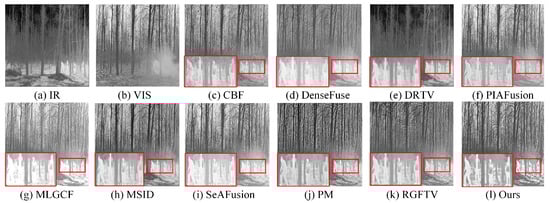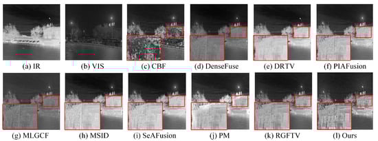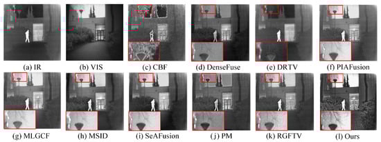 Figure 12 shows the fusion result of the “Kaptein_1123” image pair. Figure 12a,b show the clear image of a passerby. Figure 12c–k display fused images from various methods. CBF, DenseFuse, DRTV, and PM fail to preserve the sky’s brightness and introduce artifacts around the people. By contrast, MLGCF, MSID, SeAFusion, RGFTV, and VCAFusion retain the background brightness and key elements. However, VCAFusion excels by preserving edges and details in low-light regions, as seen in the enlarged red area, with clearer details of bushes, ground gaps, and tree branches in Figure 12k.