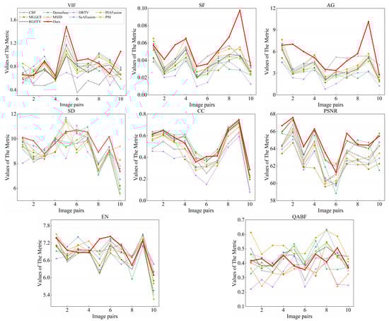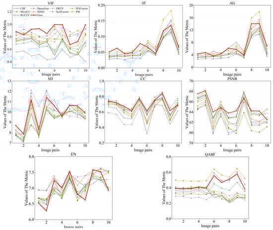 We evaluated the proposed fusion method using ten image pairs from the TNO and M3FD datasets. For comparison, we selected eight state-of-the-art techniques: six traditional methods (CBF [], DRTV [], MLGCF [], MSID [], PM [], and RGFTV []) and two deep learning-based approaches (DenseFuse [] and SeAFusion []). All methods were implemented according to their original papers. The experiments were conducted on a desktop equipped with a 3.6 GHz Intel Core CPU and 64 GB of RAM. To objectively assess performance, we employed eight evaluation metrics: VIF [], SF [], AG [], SD [], CC [], PSNR [], EN [], and QABF []. These metrics cover both reference and non-reference indices, providing a comprehensive assessment of information content, human perception, and image characteristics.