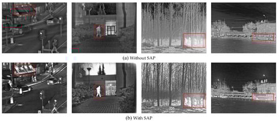 To evaluate the effectiveness of the proposed saliency-preserving strategy (SAP) for multiscale information fusion, we conducted ablation experiments comparing fusion performance with and without SAP. As shown in Figure 18, the fused images without SAP exhibited noticeable quality degradation, demonstrating the importance of the saliency-preserving strategy for effective multiscale feature integration. The quantitative results in Table 6 further confirmed this observation, where the SAP strategy consistently outperformed the baseline across all evaluation metrics. For example, significant improvements can be seen in metrics like Average Gradient and Spatial Frequency, particularly for images such as “Kaptein_1123” and “01432”. These results clearly validate the necessity of incorporating the saliency-preserving strategy in our fusion framework.