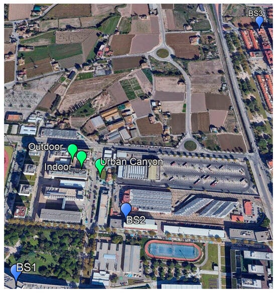 Since the BS positions are assumed to be known with a high accuracy (maximum error ≤ 0.05 m; see Table 1), the uncertainty in both values, and the accuracy of the pseudodistance , is attributed entirely to the UE’s positioning error.