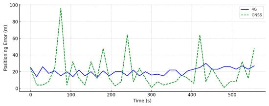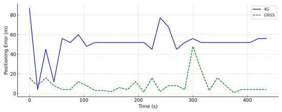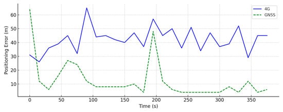 - Urban canyon scenario: GNSS also yielded the best horizontal precision in this more complex environment, with = 0.58 m and = 0.90 m. However, for the vertical component, the 4G-only solution provided the most accurate result, with = 0.12 m (Table 5).