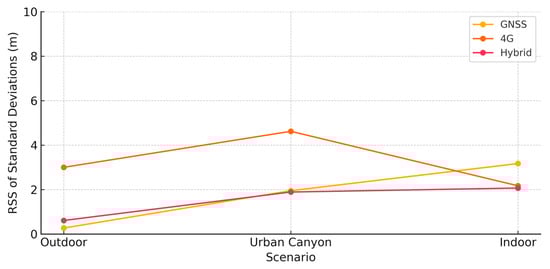 By summarizing the results in Table 16 and focusing on the performance of the proposed hybrid algorithms across the outdoor, urban canyon, and indoor scenarios, it can be observed that the position-level hybridization method consistently yielded a better precision and accuracy than the measurement-level hybridization method. The root sum square (RSS) metrics presented in Figure 8, Figure 9, Figure 10 and Figure 11 complement the tabular results by providing a visual comparison of both the precision and accuracy across methods and environments. Figure 8 and Figure 10 show the RSS of the standard deviations, highlighting the internal consistency of each solution, while Figure 9 and Figure 11 illustrate the total positioning error relative to the reference coordinates. These plots clearly confirm the superior performance of the position-level hybridization method, particularly in indoor and urban canyon scenarios, where GNSS-only methods degrade significantly. The visual summaries also reinforce the advantages of hybridization over standalone 4G or GNSS solutions, both in terms of robustness and reliability. This difference is mainly attributable to the underlying mathematical models. Measurement-level hybridization requires the linearization of GNSS pseudoranges, making it a linear approximation model [16]. Additionally, the observation equation includes a multipath error term, which increases depending on the complexity of the environment, further degrading the performance.