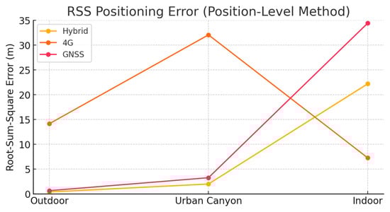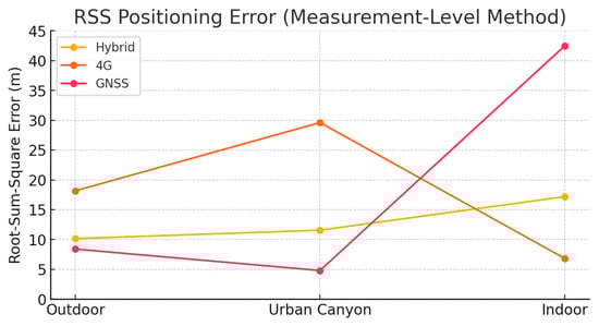 Root sum square (RSS) of positioning errors with respect to the reference coordinates for the measurement-level hybridization method. This graph summarizes the total positioning accuracy for each solution in the three test environments.