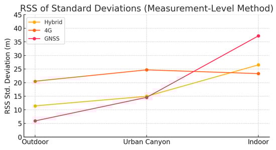Root sum square (RSS) of standard deviations for the measurement-level hybridization method across the outdoor, urban canyon, and indoor scenarios. This metric quantifies the internal precision of each method tested.