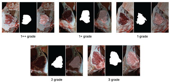 In addition to the images, segmentation masks are provided to isolate the lean meat region by removing non-meat areas. These pre-labeled masks served as ground truth annotations for training the segmentation networks used in the two-stage pipeline. The segmentation masks were provided together with the images by AI Hub. According to the dataset description, the masks were constructed using a combination of automatic and manual labeling techniques based on OpenCV, focusing on removing the outer fat surrounding the beef cross-sectional area. These pre-generated masks were used directly for training the segmentation models in the two-stage pipeline. To better illustrate the dataset composition, Figure 1 shows representative examples of RGB images and corresponding segmentation masks for each of the five quality grades (1++, 1+, 1, 2, and 3). These masks isolate the lean meat area used for training 2-stage models.
