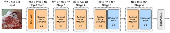 Overall architecture of the proposed EfficientViT-based 1-stage beef carcass grading model. The model integrates convolutional layers for local feature extraction and multi-scale linear attention mechanisms to capture global contextual information, enabling efficient and accurate grading without a segmentation step.