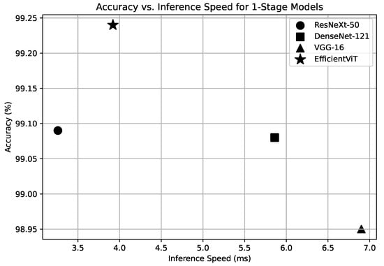 Among the two-stage models, the MobileNetV2 + ResNeXt-50 combination achieved the best performance with an accuracy of 98.42% and an F1 score of 0.9860. However, its inference speed and model size were significantly higher than those of the one-stage ResNeXt-50 model, which achieved comparable accuracy (98.30%) at only 3.26 ms and 91.96 MB. Likewise, the one-stage DenseNet-121 (Accuracy: 98.12%; F1 score: 0.9828, Speed: 5.86 ms, Size: 28.87 MB) and VGG-16 (Accuracy: 97.99%; F1 score: 0.9825) models also outperformed their two-stage counterparts across all metrics.