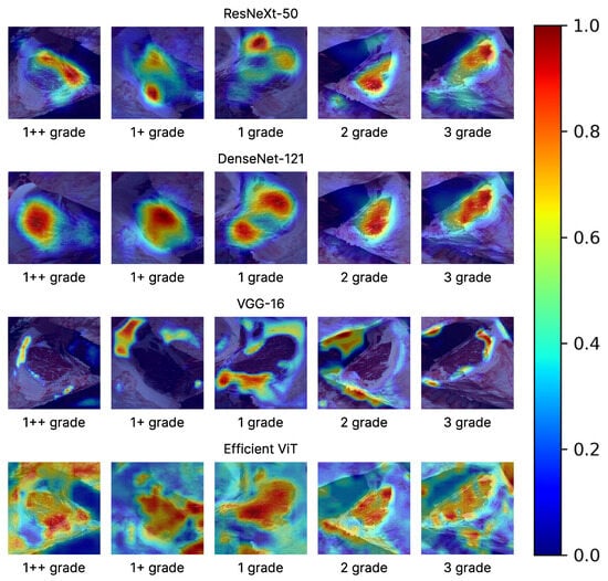 Interestingly, the ranking of average activation area—EfficientViT > DenseNet-121 > ResNeXt-50 > VGG-16—matches the models’ classification performance on the subset of samples with over 20% loin area (see Section 4.3). This supports the hypothesis that broader attention coverage is positively associated with robustness to spatial variation in beef cross-section images. These findings reveal fundamental differences in feature learning strategies and emphasize the importance of considering model architecture when explainability and spatial reasoning are required.