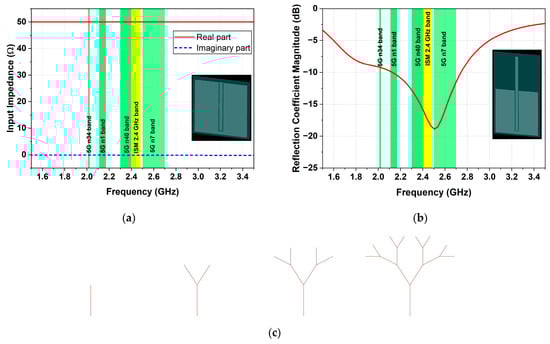 Figure 3. Antenna design process: (a) Input impedance and the numerical model of CPW; (b) reflection coefficient magnitude versus frequency and the numerical model of the optimized monopole antenna; (c) stages of forming the final fractal binary tree antenna.