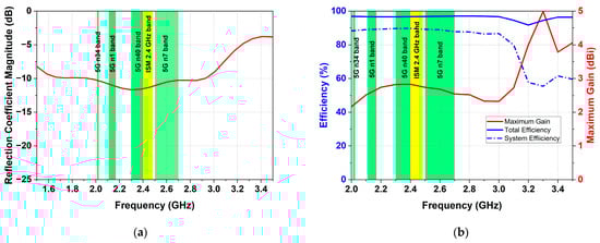 Figure 4. Simulated: (a) reflection coefficient magnitudes versus frequency; (b) radiation efficiency and maximum gain versus frequency.