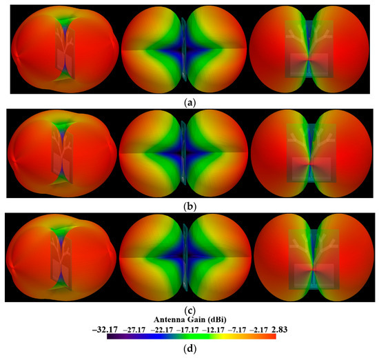 Figure 5. Three-dimensional radiation patterns of the antenna at: (a) 2.1 GHz; (b) 2.5 GHz; (c) 2.9 GHz; and (d) antenna gain scale.
