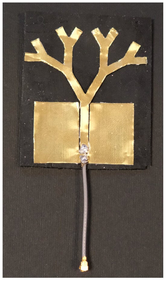 We fabricated a prototype, employing the methodology detailed in [35] to evaluate the antenna performance and validate the simulation results. The fractal tree and CPW were realized with 0.05 mm brass foil, while the flexible, eco-friendly substrate consisted of a 1.5 mm-thick natural rubber composite reinforced with RHA. For measurement purposes, a coaxial cable with a U.FL connector was soldered to the CPW, as illustrated by the photograph of the fabricated antenna prototype in Figure 6.