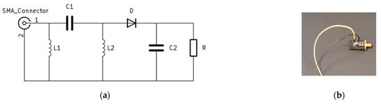 We designed and implemented a single-series rectifier circuit based on NSVR351SDSA3 Schottky diode to harvest energy from ambient RF fields in target bandwidths. We adopted a single-series diode configuration due to its balance of low complexity, reduced cost, and reliable RF-to-DC conversion performance [40]. After that, we design a matching network to achieve maximum output DC power [41]. To find the final values of the matching network elements, we adopt an iterative optimization process that combines electromagnetic simulations with prototype measurements [25]. This methodology allows the design to meet performance requirements and reduce the influences of the parasitic effects of the SMD components used in the circuit. The schematic of the circuit and a photograph of the fabricated prototype are depicted in Figure 8.