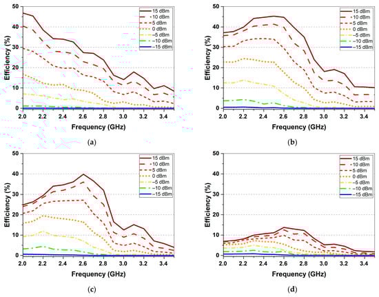 Figure 10. Rectifier RF-to-DC conversion efficiency at load resistance: (a) 51 Ω; (b) 510 Ω; (c) 1000 Ω; (d) 4999 Ω.
