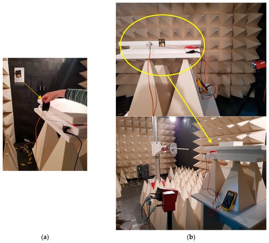 Figure 11. Fabricated prototype of the rectenna: (a) photograph of the top and back side; (b) photographs of the test setup and prototype inside a semi-anechoic chamber.