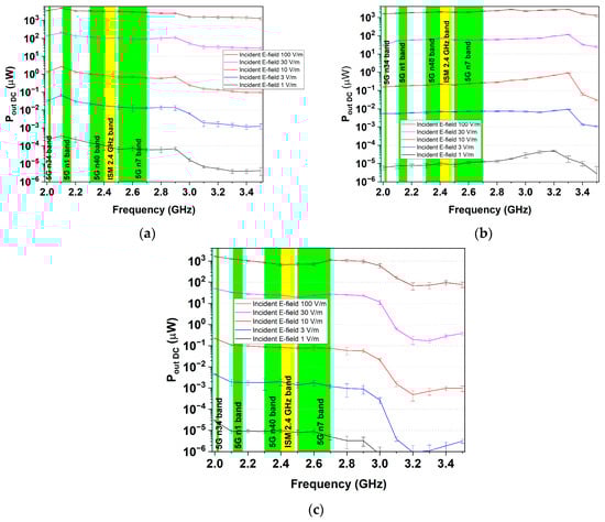 Figure 12 presents the output DC power (Pout DC), derived from the measured DC voltage at the rectenna output, as a function of frequency for five electric field intensities under different polarizations. It can be seen that the highest DC power of 4000 μW is obtained at the rectenna output when the intensity of the electric field is 100 V/m at the vertical orientation of the horn antenna. We can find from Figure 12b,c that when the transmitting horn antenna is in horizontal orientation or swept at an angle of 45°, the highest DC power in the target frequency band (2.1 GHz–2.7 GHz) is 2000 μW at 100 V/m. Also, across the targeted frequency band, for the three orientations of the horn antenna, the obtained DC powers are 100 μW, 80 μW, and 50 μW, respectively, when the electric field intensity becomes 30 V/m. From the results, we can conclude that the rectenna can effectively receive signals from all directions over the frequency bandwidth of interest, making it suitable for wireless power transfer and energy-harvesting applications. Moreover, the standard deviations remained consistently low across all measurement points, confirming the excellent reproducibility of the results. This high level of repeatability is attributed to the precision of the experimental setup and the controlled conditions provided by the use of an anechoic chamber.
