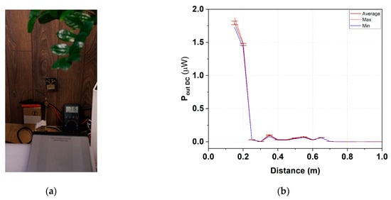 Figure 13. Output DC power (Pout DC) of the rectenna placed on the wall as a function of distance from a microwave generator: (a) photo of the measurement setup; (b) results.