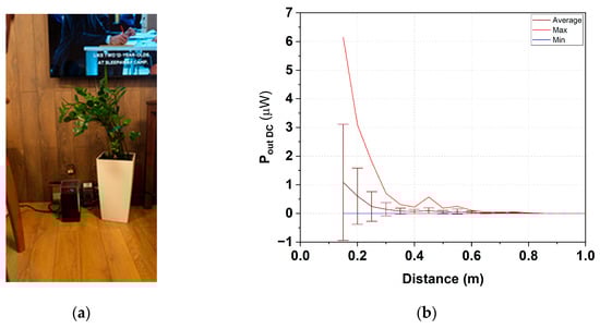 Figure 14. Output DC power (Pout DC) of the rectenna placed on the wall as a function of distance from a Wi-Fi router: (a) photo of the measurement setup; (b) results.