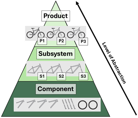 In this study, we seek to investigate the current gap between Management Accounting cost methodologies and the quantification of benefits from modularization effects. The objective is to provide greater insight into why quantifying costs remains a challenge, even when employing comprehensive cost allocation methods such as TDABC. Studies suggest that assessing the economic benefits of modularization, based on the allocation of costs at the product or project level, is not suitable for providing an accurate cost picture [5,10,12]. To accurately assess the cost and profitability of related products that share components and subsystems, the entire product portfolio of related products must be considered [20], enabling an aggregated cost evaluation across the product portfolio based on common modules and components [5]. This may be possible by conducting assessments in smaller increments rather than at the product or project level, which can be considered an aggregation of costs related to subsystems and components [17]. This initial insight informs the study’s hypothesis. The levels of abstraction are defined based on the product data structure found in Enterprise Resource Planning (ERP) systems, 3D models, and Bill-of-Materials (BOMs), in which the decomposition of a product in a manufacturing company can be found [67]. The hypothesis is that defining abstraction levels based on current product structures may provide a means to address the challenges of accurately allocating indirect product costs throughout the life cycle. The three levels of abstraction are defined as product, subsystem, and component, as visualized in Figure 1. A bicycle is depicted in the figure to provide context. The upper-level, product, consists of finished goods or products that can be sold as a single unit (e.g., a fully finished bicycle) [37]. It will have a unique item or product number for the specific variant sold. In this case, we will denote the bicycles as three product variants: P1, P2, and P3. On the next level, we have subsystems (e.g., the frame of the bike), a term similar to subassembly or module, which are used broadly in the literature and industry [56]. Each subassembly will also have a unique item number. The combinations of subsystems make up a product. In this case, we will denote the three frames depicted as three subsystem variants: S1, S2, and S3. On the lowest level of abstraction, we have components (e.g., frame elements, fork legs, tire, etc.). Each component will have a unique part number. A combination of these comprises the subsystems. A component always consists of only one unit. However, the company determines what a single unit or component is in relation to their product. For example, a rubber tube would often be considered a single component for a bicycle manufacturer, even though it consists of a tube and a tube valve, since it is bought from an external supplier. With this definition in place, we can provide a simple example based on Israelsen and Jørgensen’s [5] findings, illustrating why this product structuring proves problematic for allocating costs in a modular product structure following traditional costing methods.