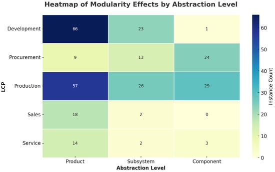 Thus, the distribution of abstraction levels within each LCP is clearly visualized. For example, in the development phase, modularity effects are predominantly addressed at the product level, with a total of 66 instances, compared to 23 at the subsystem level and just 1 at the component level. The insights that can be drawn from these results will be discussed in the next section.