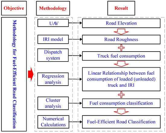 In order to derive the methodology for classifying fuel-efficient roads, this research entailed establishing the correlation between fuel consumption and road roughness. The subsequent classification of fuel consumption was subsequently employed to achieve the classification of road roughness. The research process involved the use of UAVs to obtain road elevation information, as well as the application of IRI models to determine road roughness. The specific workflow is shown in Figure 1.