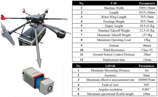 The elevation data was obtained from the point cloud pit model provided by the Haerwusu Open-pit Coal Mine. Point cloud model data was collected using the PH-25EX hexacopter, developed by Chengdu Zongheng Dapeng UAV Technology Co., Ltd. (Chengdu, China), equipped with Light Detection and Ranging (LiDAR) technology. This enabled high-quality detection of multiple objects and accurate echo data acquisition. The acquired point cloud data was clear, retaining the distinctive characteristics of the object with high resolution. The specifications regarding the PH-25EX and the LiDAR system are provided in Figure 2.