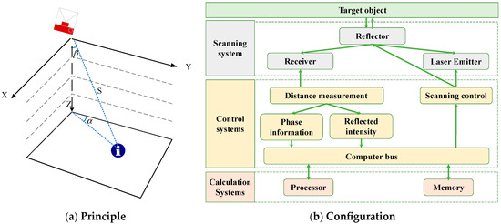 The LiDAR scanner operates based on the principle of laser ranging to measure the distance to feature points on the surface of an object and calculate their three-dimensional coordinates. This data was then used to generate a three-dimensional surface that provides spatial information. The LIDAR system comprises three main components: the scanning system, the control system, and the computer module. The control system, managed via a computer bus, is responsible for controlling the scanning and ranging modules. Meanwhile, the computer module primarily consists of a microprocessor and memory, facilitating the exchange of information with the control system. The schematic representation of the principle and configuration of the LiDAR system are depicted in Figure 3a and Figure 3b, respectively.