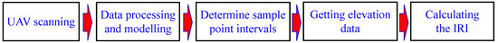 In the practical application of Equation (2), the process of obtaining continuous sample points for IRI calculation from the mine road surface model involves the following steps: First, UAV-acquired point cloud data of the mining area is obtained. However, as the spacing between point cloud data points is non-uniform, while Equation (2) requires equal intervals between sample points, further processing is necessary. The point cloud model is therefore converted into a DEM (Digital Elevation Model). This conversion enables the generation of continuous, equally spaced sample points by projecting a line composed of uniformly distributed points onto the DEM surface. Once these regularly spaced sample points are acquired, the IRI can be calculated. The complete workflow is illustrated in Figure 5.
