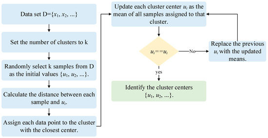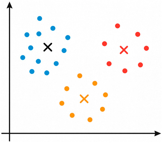 Clustering is the process of classifying and organizing data points in a dataset that are similar in some way (Figure 6), a technique often referred to as unsupervised learning [28]. The K-means is one of the well-known clustering algorithms, and its simplicity and efficiency make it the most widely used [29,30]. In this study, the K-means algorithm was used to classify truck fuel consumption. In general, the K-means algorithm comprises five steps, as is shown in Figure 7.