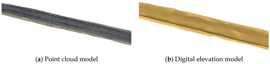 Part of the point cloud data of the road captured by the UAV is shown in Figure 9a. The point cloud model is a filtered model with some erroneous points removed. The model is complete, but it is difficult to obtain continuous point cloud elevations with consistent length intervals because some points are filtered. Therefore, this study constructed a road DEM, as shown in Figure 9b, based on the TIN (Triangulated Irregular Network) method, which is usually used for high-precision modeling of smaller areas [31], which makes the discrete point cloud road model, into a continuous surface model, and facilitates the acquisition of the continuous elevation changes in the road.