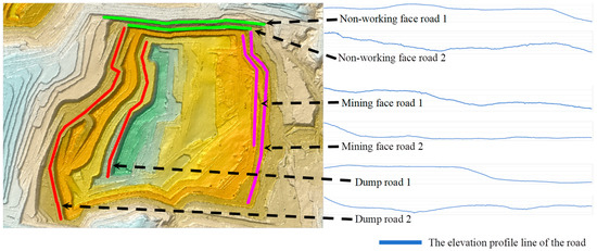 The statistical process was based on the Chinese 3DMine 2016 version software, a mining design software similar to Surpac developed by Beijing 3DMine Software Ltd. [32]. Initially, the point cloud data provided by the mine was imported into the software, and a DEM was generated. Subsequently, the route within the selected road area was delineated at 1 m point intervals. In the final step, the elevation change curve of the road was obtained by mapping all the points along the line onto the DEM. The elevation of each point, representing the sampling point as described in Equation (2), was used for the calculation of the IRI. The statistical results for the six distinct road sections are visualized in Figure 11.
