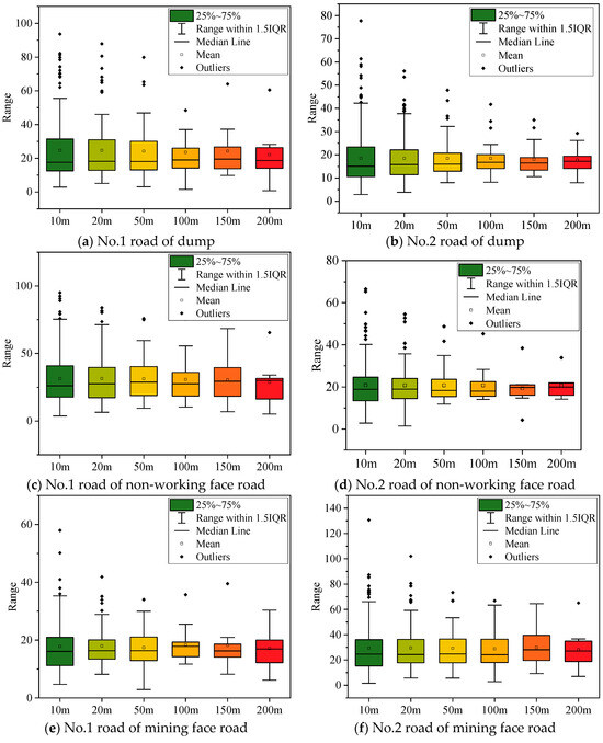 In addition to reflecting the overall distribution of the data, the box plot can clearly display outliers within the dataset. As shown in Figure 11, a considerable number of outliers are observed when the interval ranges between 10 and 50 m, indicating that the classification method at this stage fails to adequately represent the variations in road quality. When the interval is set to 200 m, the range of variation exhibits a statistically distinct pattern compared to intervals of 100 and 150 m, as illustrated in Figure 11c,e,f, suggesting that intervals of 100 and 150 m are relatively reasonable. Comparing the 100 m and 150 m intervals, this study concludes that the larger interval is more practical for real-world applications. Therefore, a 150 m interval is ultimately selected as the statistical interval.