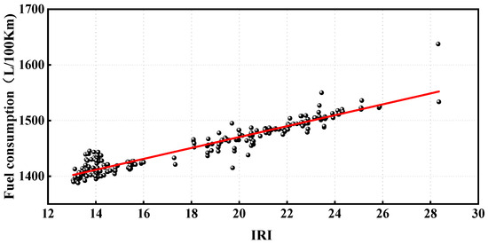 Based on the transport records in the truck dispatch system of the Haerwusu open pit coal mine, the transport routes of the trucks were obtained, and the specific trajectories of the trucks were determined in the DEM based on the positions recorded by GPS in order to calculate the IRI. The total number of data points is 188. The fitted relationship between the fuel consumption of the loaded trucks and the IRI is shown in Figure 12.